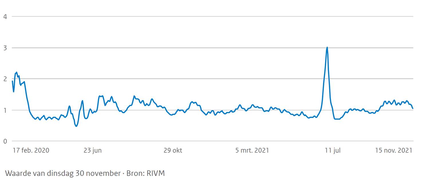 Ontwikkeling van de R-waarde. Bron: https://coronadashboard.rijksoverheid.nl/ landelijk/reproductiegetal
